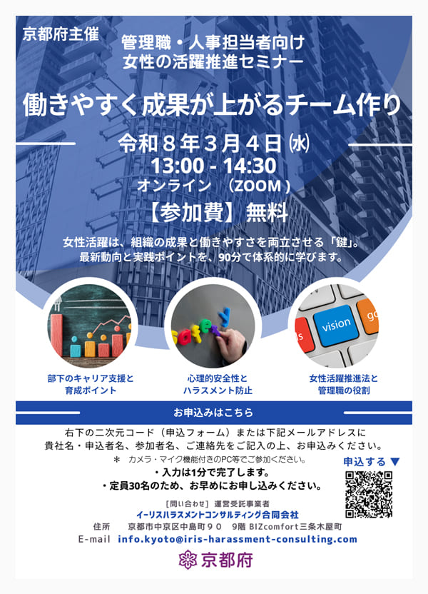 経済団体等と行政(京都府・京都市・京都労働局)が連携し、企業における女性活躍推進を支援しています。